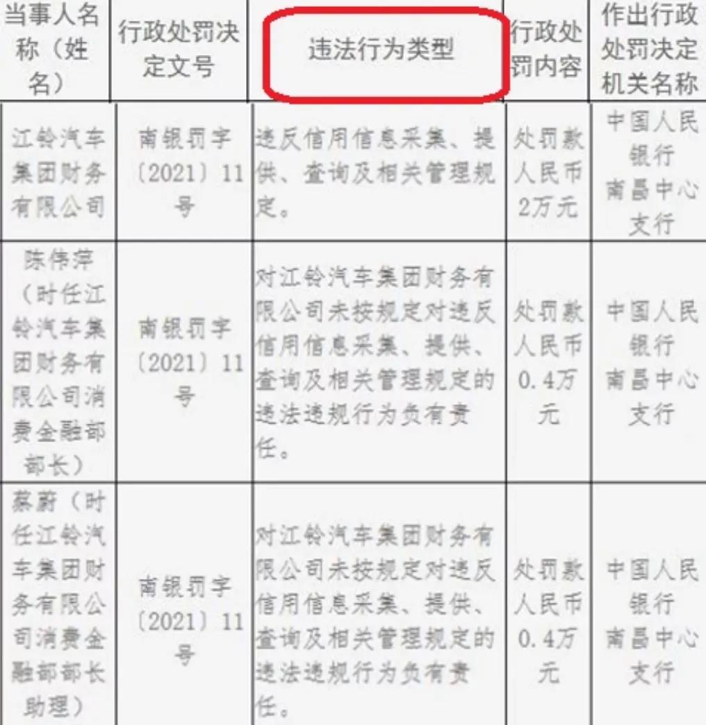 据中国经济网报道,日前,中国人民银行南昌中心支行网站公布的行政处罚信息公示表显示,江铃汽车集团财务有限公司违反信用信息采集、提供、查询及相关管理规定,被中国人民银行南昌中心支行处罚款人民币2万元。时任江铃汽车集团财务有限公司消费金融部部长陈伟萍、部长助理蔡蔚对上述违法违规行为负有责任,被中国人民银行南昌中心支行分别处罚款人民币4000元。