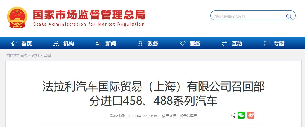 日前,法拉利汽车国际贸易(上海)有限公司根据《缺陷汽车产品召回管理条例》和《缺陷汽车产品召回管理条例实施办法》的要求,向国家市场监督管理总局备案了召回计划。自2022年5月30日起,召回2010年3月2日至2019年3月12日期间生产的部分进口458 Italia、458 Speciale、458 Speciale A、458 Spider、488 GTB和488 Spider系列汽车,共计2222辆。