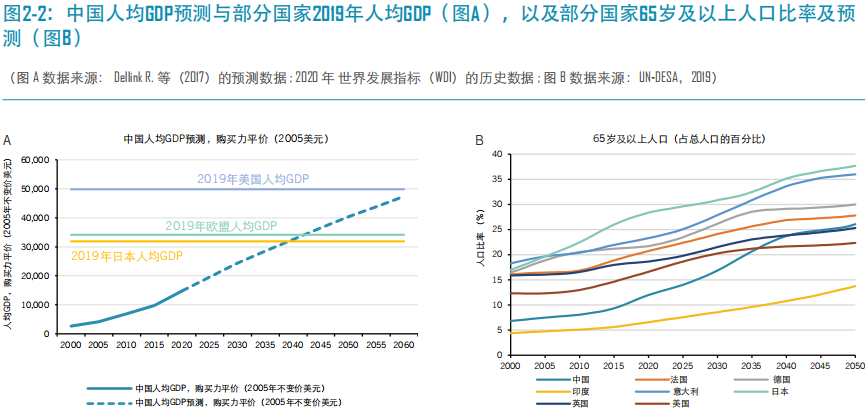 新增长路径关注的不是当今的中国,而是未来的中国,这一点至关重要。到 2060 年中国将发生翻天覆地的变化,届时,中国人民生活水平将接近当前大多数发达经济体(图 2-2A),老龄化程度加深(图 2-2B)。此外,中国城市人口将不断增加,到 2050 年中国城市化率将达到 80%(联合国经济社会事务部,2018)。