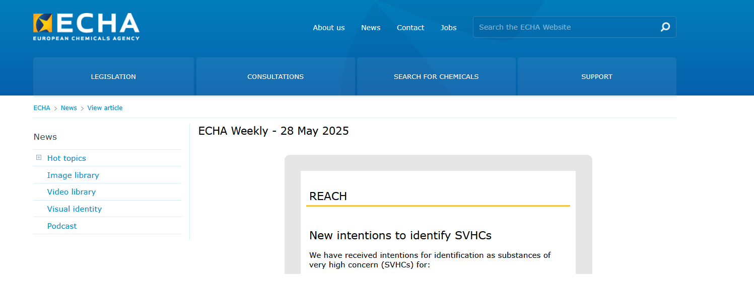 5月28日,ECHA发布将以下物质确定为意向高度关注物质(SVHCs),详细内容如下: