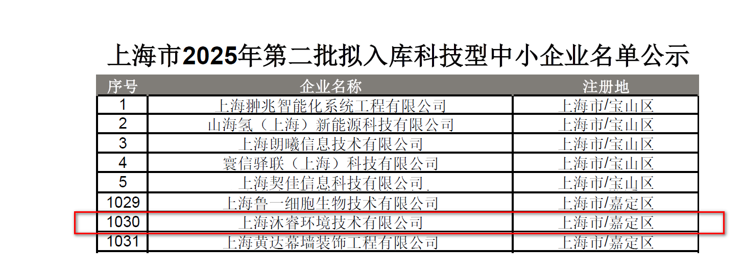 近日,上海市科学技术委员会公布了2025年第二批拟入库科技型中小企业名单,上海沐睿环境技术有限公司凭借其卓越的科技创新能力和研发实力成功入选,这是公司在科技创新道路上的一座重要里程碑。
