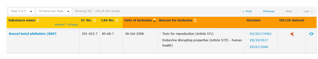 中文名称:邻苯二甲酸丁苄酯,英文名称:Benzyl butyl phthalate,CAS号:85-68-7,EC号:201-622-7,2008年10月28日,被列为SVHC第一批清单。