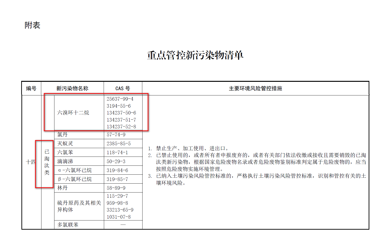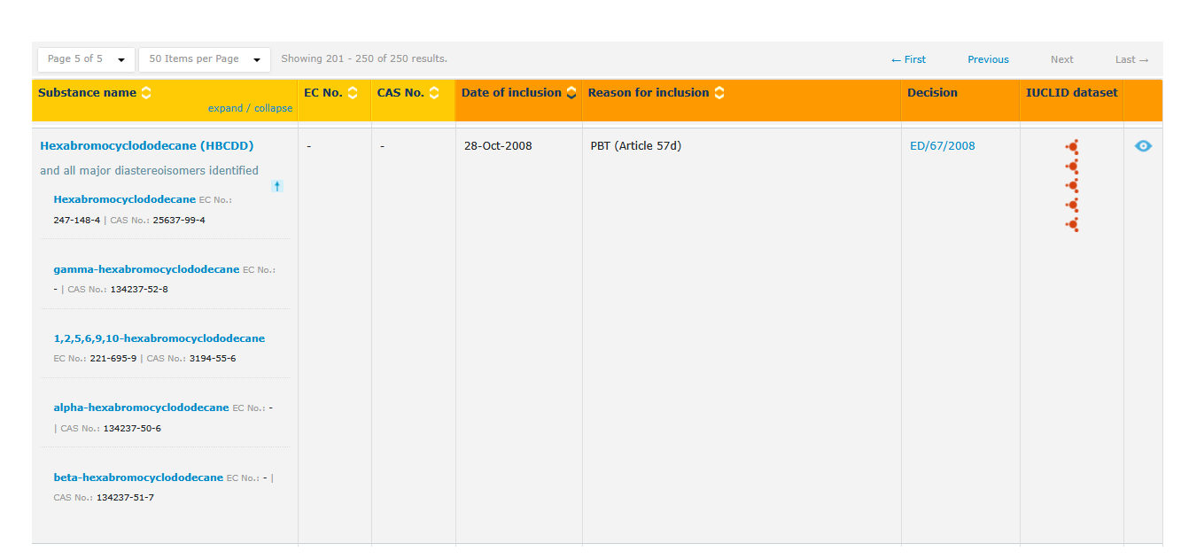 中文名称:六溴环十二烷(HBCDD),英文名称:Hexabromocyclododecane (HBCDD);物质组成员包括:中文名称:1,2,5,6,9,10-六溴环十二烷,CAS号:3194-55-6,EC号:221-695-9;中文名称:六溴环十二烷,CAS号:25637-99-4,EC号:247-148-4;中文名称:α-六溴环十二烷,CAS号:134237-50-6,EC号:603-801-9;中文名称:β-六溴环十二烷,CAS号:134237-51-7,EC号:603-802-4;中文名称:γ-六溴环十二烷,CAS号:134237-52-8,EC号:603-804-5,2008年10月28日,被列为SVHC第一批清单。