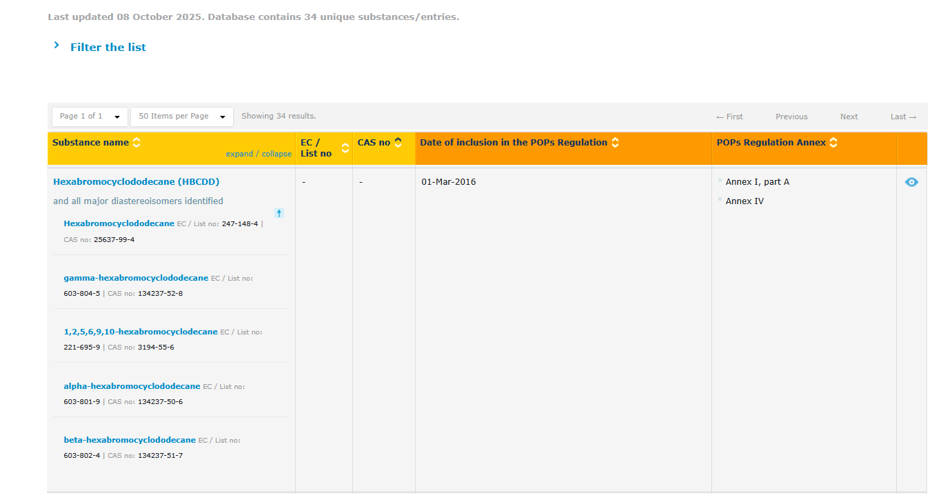 2016年3月1日,欧盟官方公报发布新法规,对欧盟持久性有机污染物(POPs)法规(EC) No 850/2004进行修订,HBCDD(六溴环十二烷)作为禁用物质正式加入附录I禁用物质列表,即HBCDD浓度小于等于100mg/kg(以重量计0.01%)的物质、混合物、物品或物品中的阻燃剂成分,必须在2019年3月22日前接受欧盟委员会的审查。对于建筑用发泡聚苯乙烯及挤出聚苯乙烯有一定的豁免时间。该法规于2016年3月22日生效。