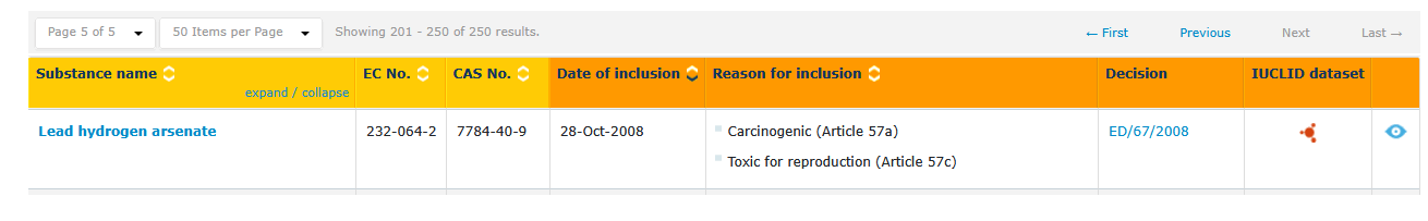 中文名称:砷酸铅,英文名称:lead arsenate,CAS号:7784-40-9,EC号:232-064-2,2008年10月28日,被列为SVHC第一批清单。