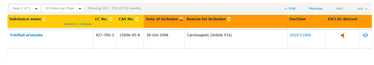 中文名称:三乙基砷酸酯,英文名称:triethyl arsorate,CAS号:15606-95-8,EC号:427-700-2,2008年10月28日,被列为SVHC第一批清单。