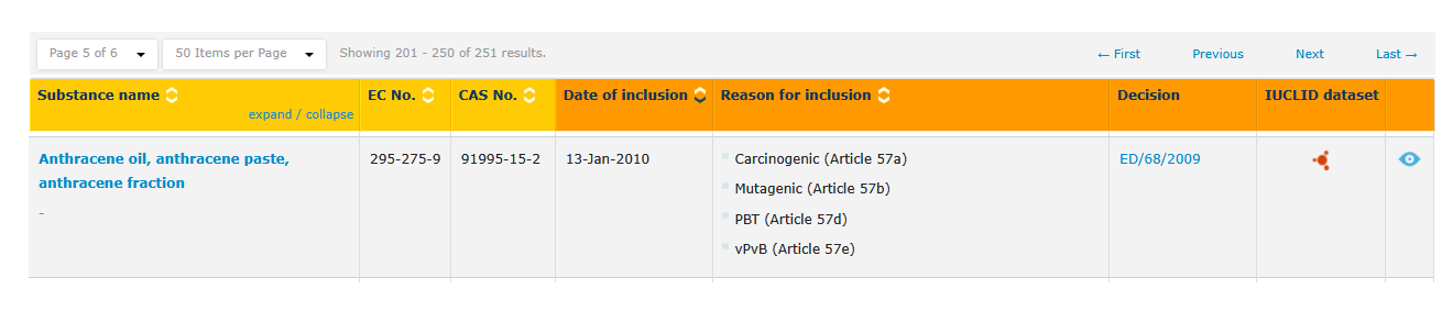 中文名称:蒽油,蒽糊,蒽馏分,英文名称:Anthracene oil, anthracene paste, anthracene fraction,CAS号:91995-15-2,EC号:295-275-9,2010年01月13日,被列为SVHC第二批清单。
