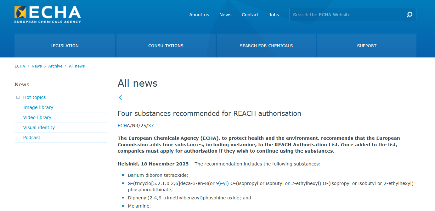 欧洲化学品管理局(ECHA)为保护人类健康和环境,建议欧盟委员会将包括三聚氰胺在内的四种物质列入“REACH授权清单”,一旦将这些物质列入清单,相关企业若要继续使用这些物质,则必须申请授权许可。截止目前附录14(授权清单)一共59项。