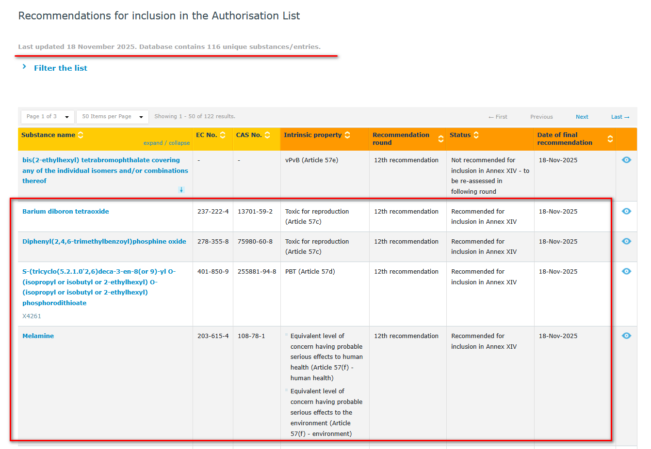 欧洲化学品管理局(ECHA)有法律义务定期向欧盟委员会推荐候选清单中的物质,以便将其纳入授权清单,在向欧盟委员会提交推荐意见之前,ECHA会考虑在为期三个月的咨询期间收到的反馈意见以及成员国委员会的意见。