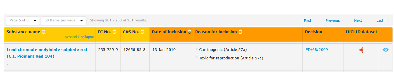 中文名称:颜料红104,英文名称:Lead chromate molybdate sulphate red (C.I. Pigment Red 104),CAS号:12656-85-8,EC号:235-759-9,2010年01月13日,被列为SVHC第二批清单。