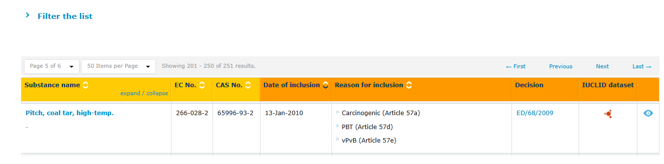 中文名称:高温煤焦油沥青,英文名称:Pitch, coal tar, high-temp.,CAS号:65996-93-2,EC号:266-028-2,2010年01月13日,被列为SVHC第二批清单。