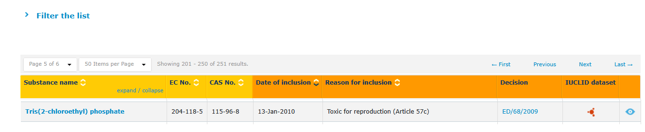 中文名称:磷酸三(2-氯乙基)酯,英文名称:Tris(2-chloroethyl) phosphate,CAS号:115-96-8,EC号:204-118-5,2010年01月13日,被列为SVHC第二批清单。