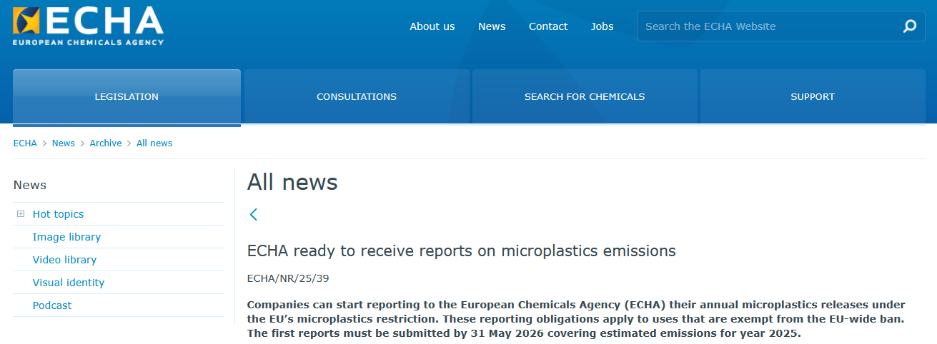 企业可依据欧盟的微塑料限制规定,向欧洲化学品管理局(ECHA)报告其每年的微塑料排放量。这些报告义务适用于那些不受欧盟全面禁令约束的用途,首批报告须于2026年5月31日前提交,内容涵盖2025年的预计排放量。