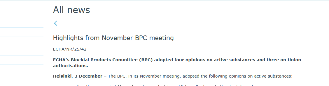 欧洲化学品管理局的生物杀灭产品委员会(BPC)就活性物质事项通过了四项意见,并就欧盟授权事项通过了三项意见。