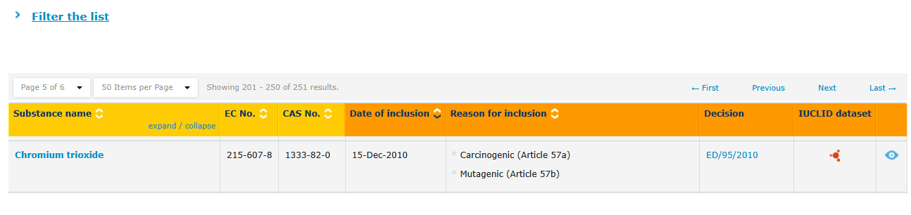中文名称:三氧化铬,英文名称:Chromium trioxide,CAS:1333-82-0, EC:215-607-8,2010年12月15日,被列为SVHC第四批清单。