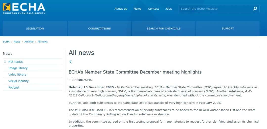 赫尔辛基,2025年12月15日,欧洲化学品管理局(ECHA)成员国委员会(MSC)在12月会议上一致同意将正己烷和4,4’-[2,2,2-三氟-1-(三氟甲基)亚乙基]双酚(BPAF)及其盐类认定为高关注度物质(SVHC)。至此,高关注度物质(SVHC)将增加到253项。