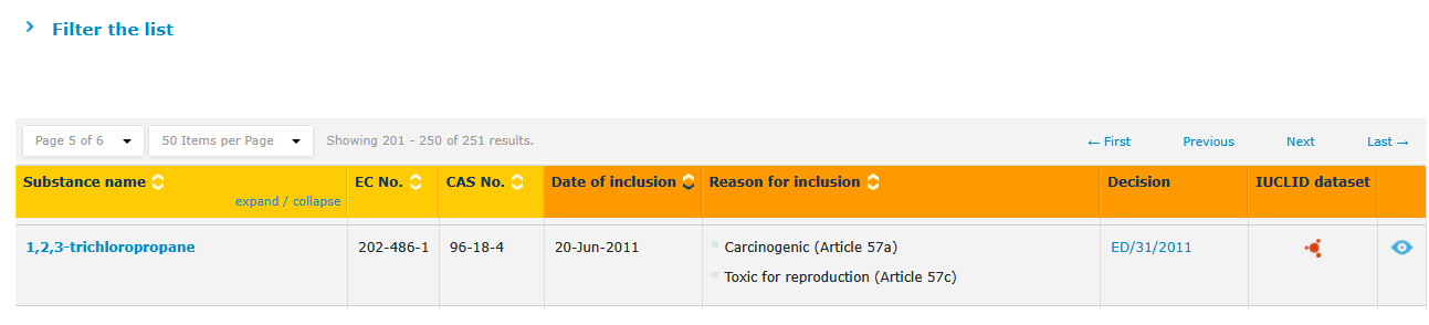 中文名称:1,2,3-三氯丙烷,英文名称:1,2,3-trichloropropane,CAS:96-18-4, EC:202-486-1,2011年06月20日,被列为SVHC第五批清单。