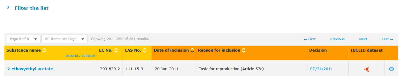 中文名称:乙二醇乙醚醋酸酯,英文名称:2-ethoxyethyl acetate,CAS:111-15-9, EC:203-839-2,2011年06月20日,被列为SVHC第五批清单。